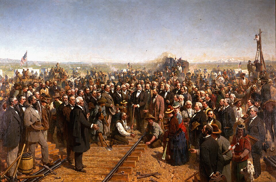 “The Driving of the Last Spike” painted by Thomas Hill – The painting depicts the ceremony of the driving of the “Last Spike” at Promontory Summit, UT, on May 10, 1869, joining the rails of the Central Pacific Railroad and the Union Pacific Railroad. It is worth noting that some of the people depicted in the painting were not at the Gold Spike ceremony (e.g., Collis P. Huntington, Charles Crocker, Edwin B. Crocker, Theodore Judah and Mark Hopkins). Only two of the members of the Central Pacific board of directors were present: Leland Stanford and Charles Marsh (who are depicted in the painting).