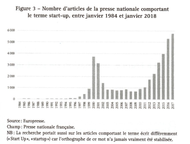 C’est le titre du chapitre 2. Et la deuxième page de ce chapitre inclut la figure qui suit. On voit aisément que la presse française a commencé à s’intéresser au sujet lors de la bulle internet puis à nouveau depuis 2012. Manon Flécher nous explique que cette seconde période n’est pas anodine, date de l’arrivée de Uber et de Airbnb en France mais aussi de la création de BPIFrance et de la French Tech. De manière tout aussi intéressante, l’auteur rappelle que le Général de Gaulle s’était rendu à San Francisco en 1960, Georges Pompidou 10 ans plus tard, François Mitterrand en 1984. L’auteur ne mentionne pas la création de Sophia Antipolis en 1969 dont Paul Graham se moque plus ou moins gentiment (voir mon post en date de 2011). Les présidents Hollande puis Macron sont apparemment des présidents autrement plus impliqués par le sujet.