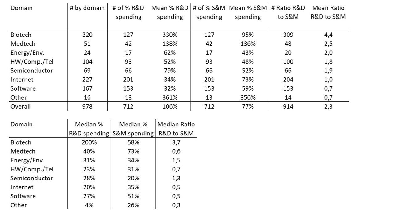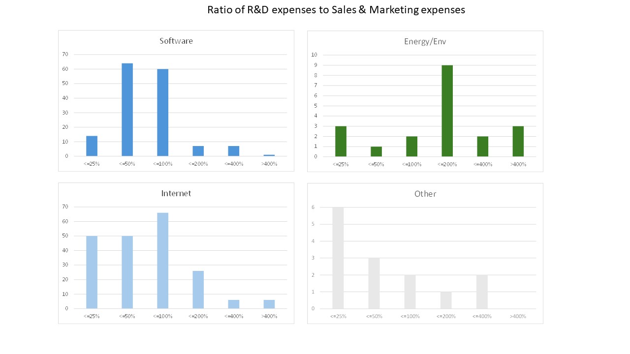 Deuxièmement, le ratio entre R&D (recherche et développement) et S&M (ventes et marketing) dans les 8 différents domaines