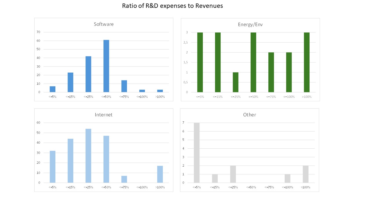 Je n’ai pu tirer aucune conclusion et, pire encore, les résultats étaient difficiles à interpréter. Je ne suis pas certain que cela soit plus clair, mais outre les valeurs moyennes et médianes de l’intensité R1D (par rapport au chiffre d’affaires ou aux ventes & marketing), j’ajoute ici quelques figures illustrant la fréquence de ces valeurs.
