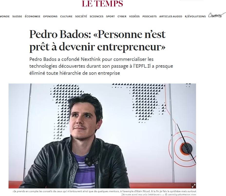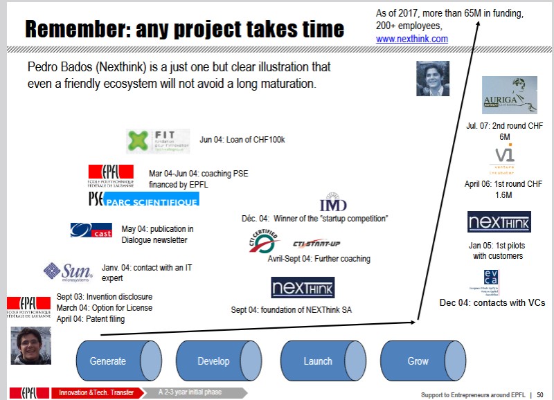 So I will just try to illustrate here the reasons for my sadness. A simple anecdote to start: I arrived at EPFL in 2004. The first file on which I worked was the project of a young Spanish student, Pedro Bados. He had just finished his master’s thesis as part of an exchange program and his work had produced some nice results. These results were patented, and the student turned into an entrepreneur when he founded NEXThink which today has about one hundred employees. The start-up, which is headquartered on the EPFL campus, is supported in part by foreign capital due to the weakness of the Swiss venture capital scene.
